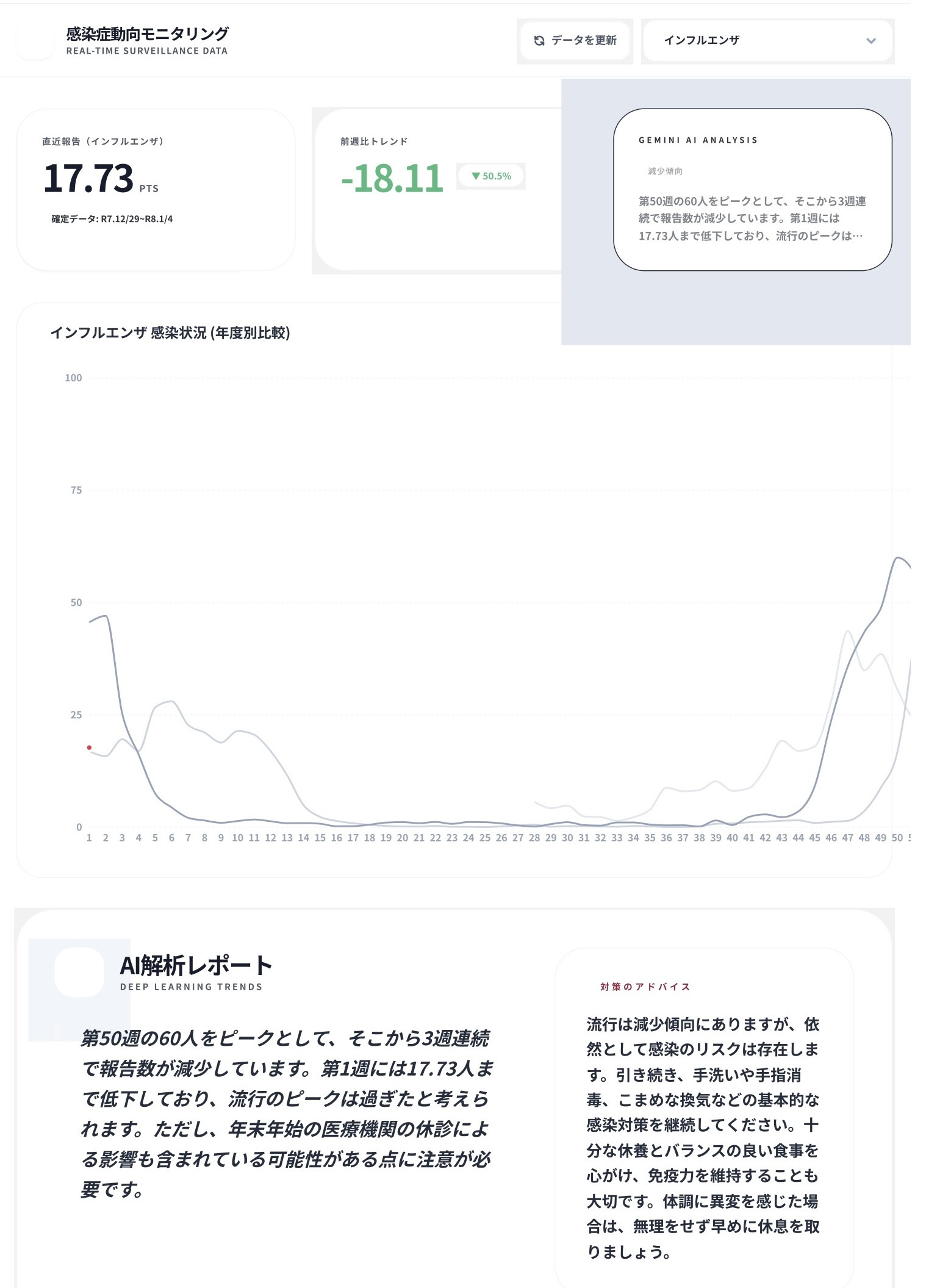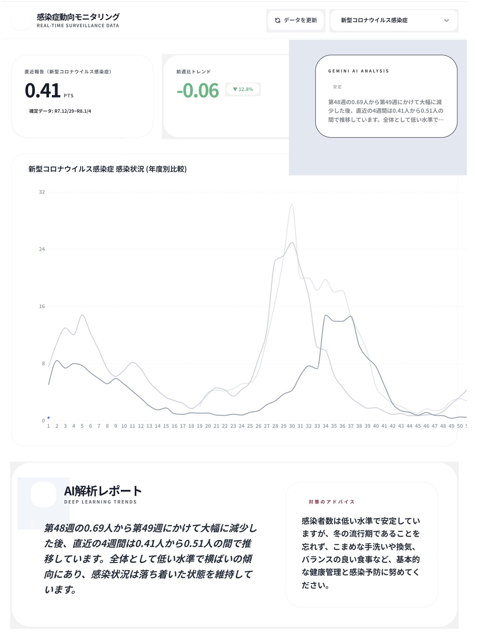 画面は、長崎県 感染症情報速報をグラフ化して作成したアプリの画面です(https://ai.studio/apps/drive/1cPZdmRrgXkBU95VaDc2AGvrC1amQmcka)