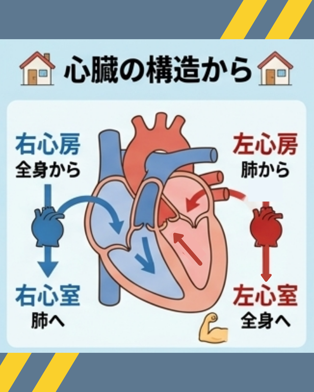 - 左心室:全身へ血液を送り出す(一番パワフル💪)